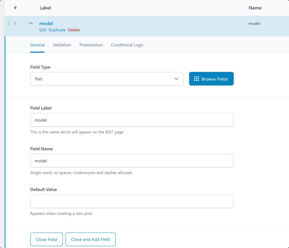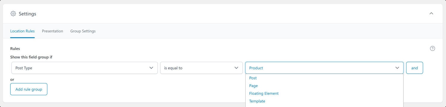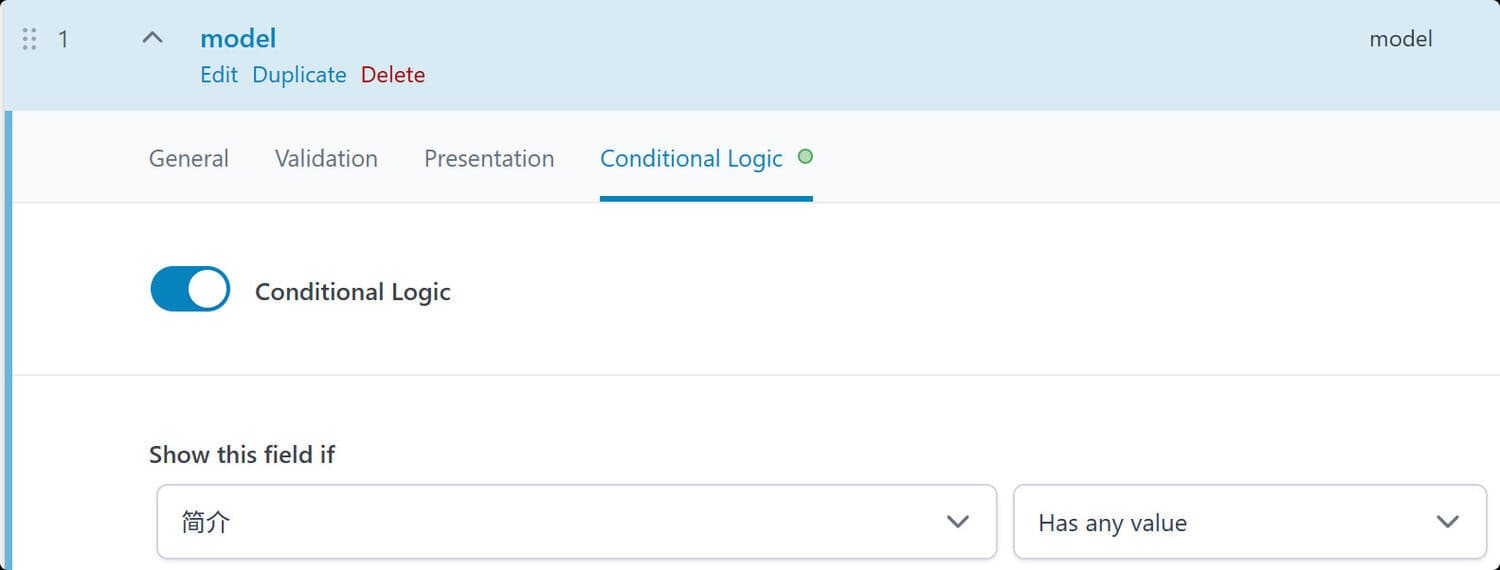 - 条件: 譬如可以设置仅当“文章类型”为“产品”时显示当前字段组